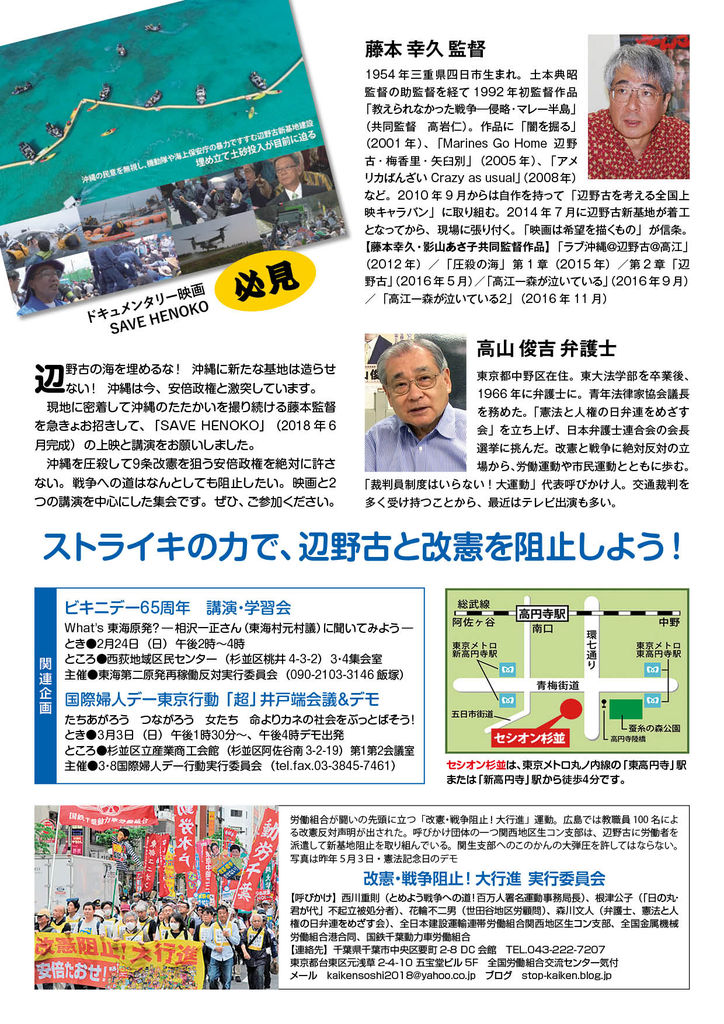 講演◆藤本幸久さん(映画監督)「沖縄の闘いに連帯を」、高山俊吉さん(弁護士)「戦争への道を阻むために」/資料代500円