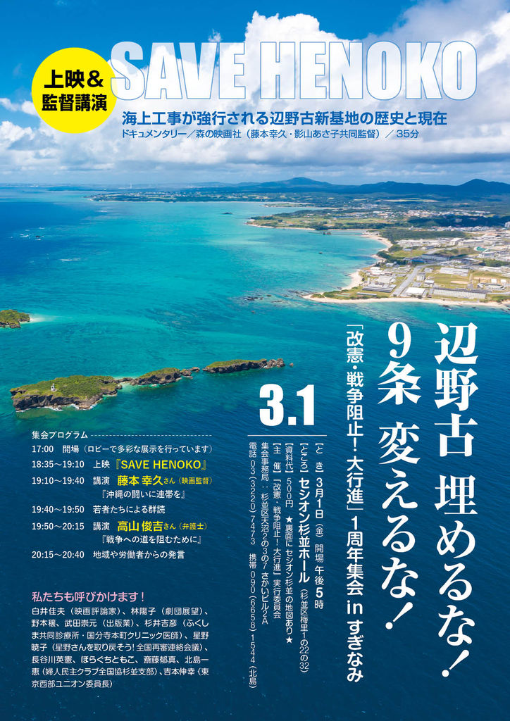 とき◆3月1日(金)午後6時35分~『SAVE HENOKO』上映、7時10分~集会