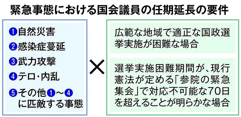 選挙困難事態が認定された場合、議員任期を延長する。選挙困難事態の期間の上限は最大1年とした。行政監視機能を維持するため、期間中は国会閉会や衆院解散、憲法改正を禁止。一方、危機管理能力を欠く首相を代える事態を想定し、内閣不信任決議案の提出は認める。