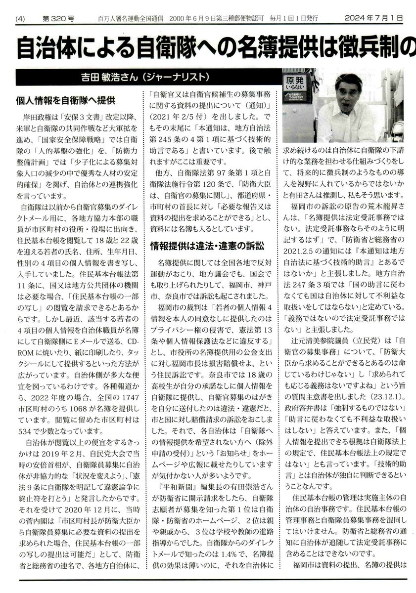 4-5-6面は、地方自治体と自衛隊問題です。『赤紙と徴兵』の著者・吉田敏浩さんにお話を伺いました。