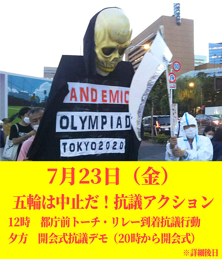 開会式が行われる7月23日には、東京でいくつかの抗議行動が予定されています。コロナ対策をしながら、一人でも多くの参加で、全国に、全世界に「五輪は中止、命を守ろう」と発信していきましょう。(S)