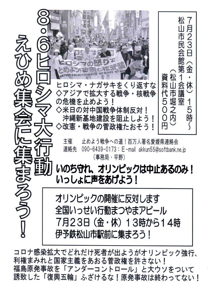 「五輪開会式粉砕!菅たおせ!7.23渋谷デモ」と連帯して、愛媛・松山でも東京五輪中止をあくまで求める行動やります。「お上の決めたことに従え」「国策に反対する者は非国民」こそ五輪を強行する政府・ブルジョアジー本音です。あくまで五輪反対!菅をたおそう!