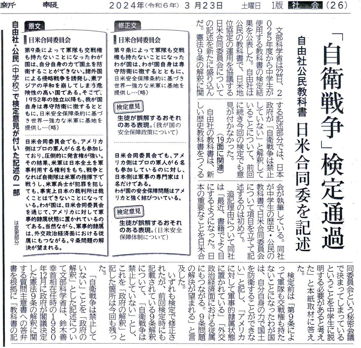3月22日、文部科学省が2025年から使われる中学校教科書の検定結果を公表しました。新聞報道では「デジタル教材急増 届かぬ検定の目」などの見出しが目立ち、こういうことも新たな問題になっていることがわかります。その中で、「『自衛戦争』検定通過」の見出しにびっくりしました。