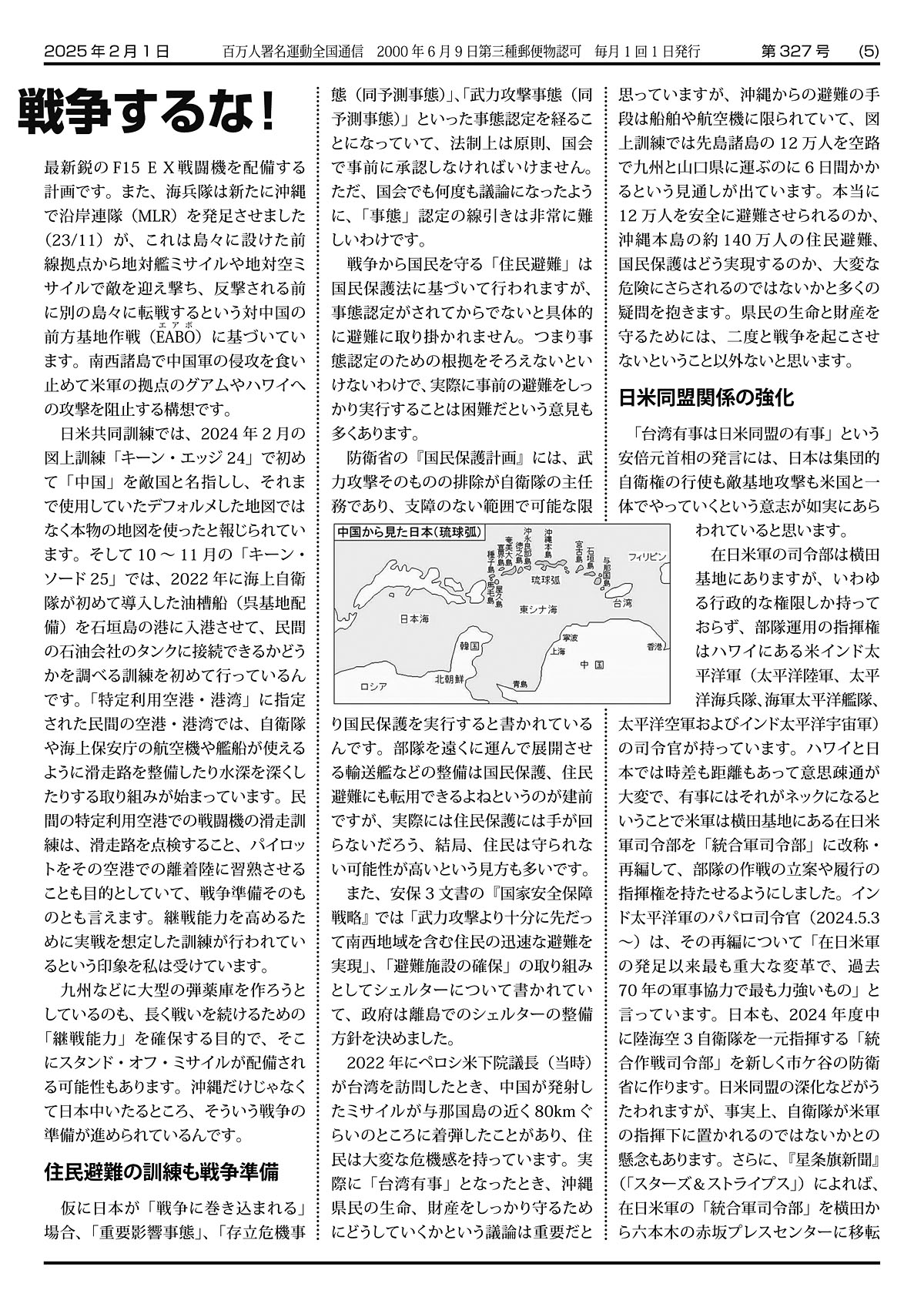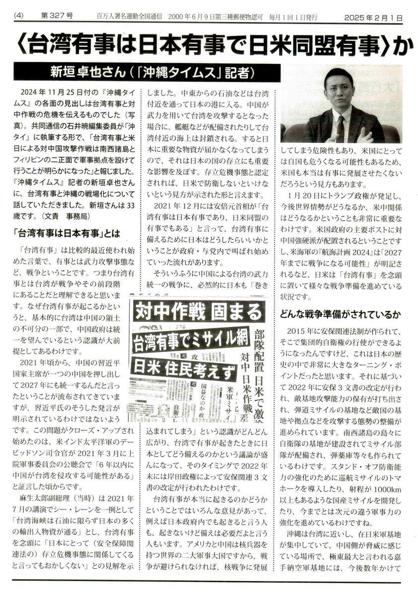 4-5面は、「台湾有事は日本有事」と言われている問題について、沖縄タイムス記者の新垣卓也さんに詳しくお聞きし、まとめました。
