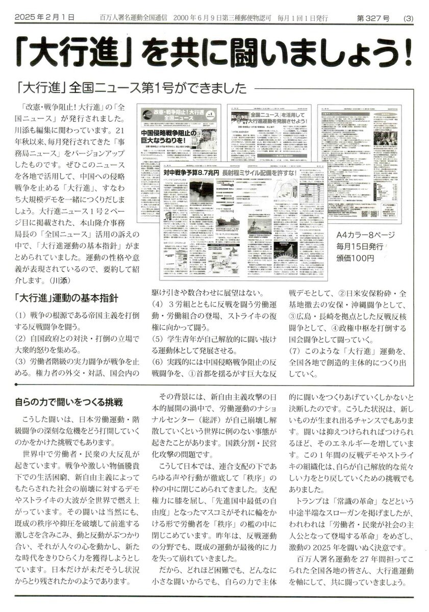 3面上段は、この1月に第1号が発行された「大行進全国ニュース」の紹介です。
