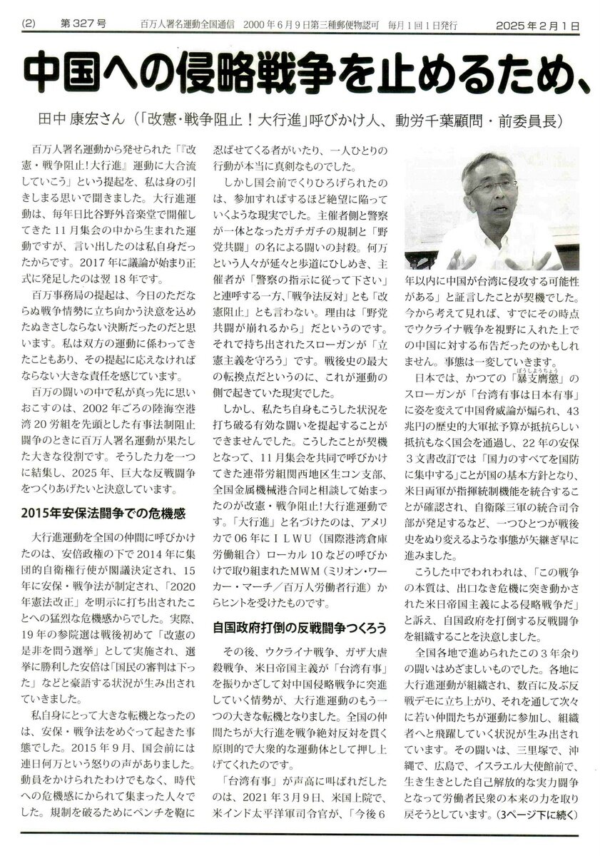 2面は、「改憲・戦争大行進」運動呼びかけ人の田中康宏さん(動労千葉前委員長)からのアピールです。百万人署名運動の大行進運動への大合流方針を受け、日本階級闘争の発展を大行進運動で切り開くという決意と連帯の思いを語っていただきました。