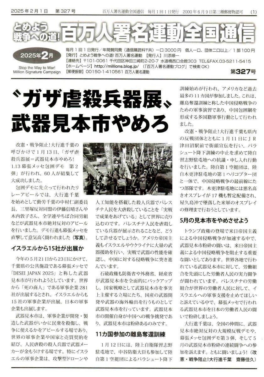 今号1面は、改憲・戦争阻止!大行進千葉の仲間から、5月に千葉県の幕張メッセで行われようとしている武器見本市に反対しようという訴えです。