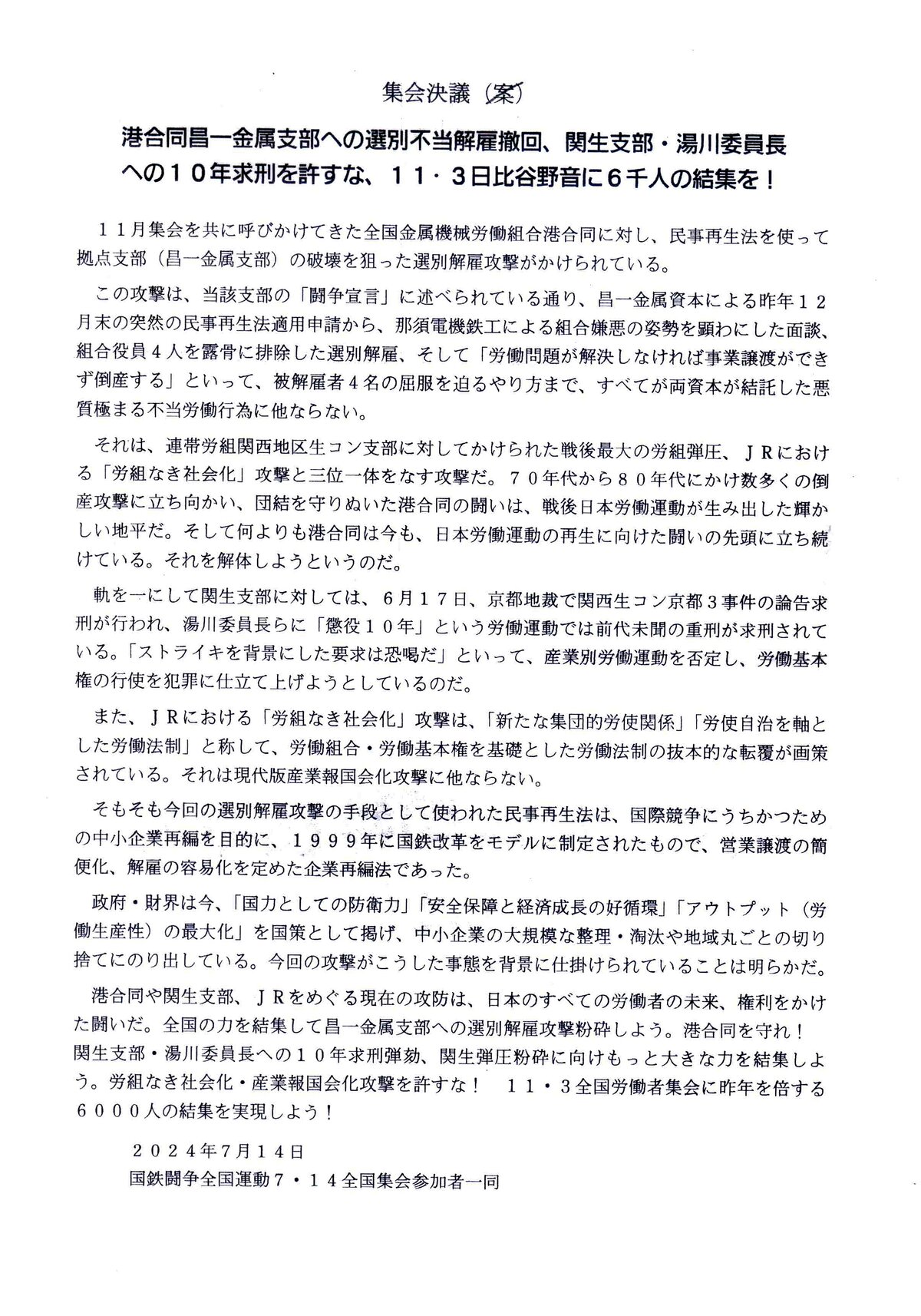 集会の最後に、読み上げられて確認された3労組の訴えと、集会参加者で確認された「決議案」です。