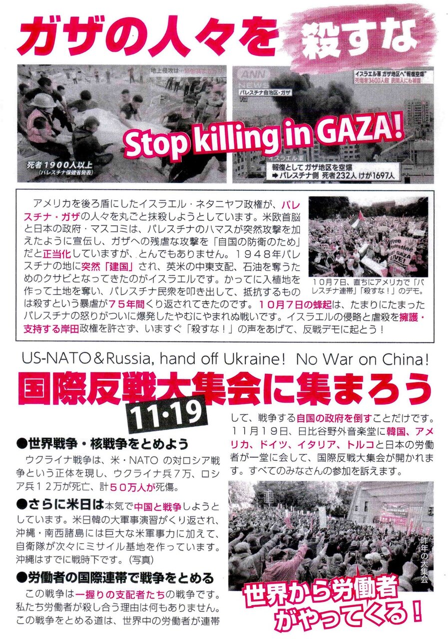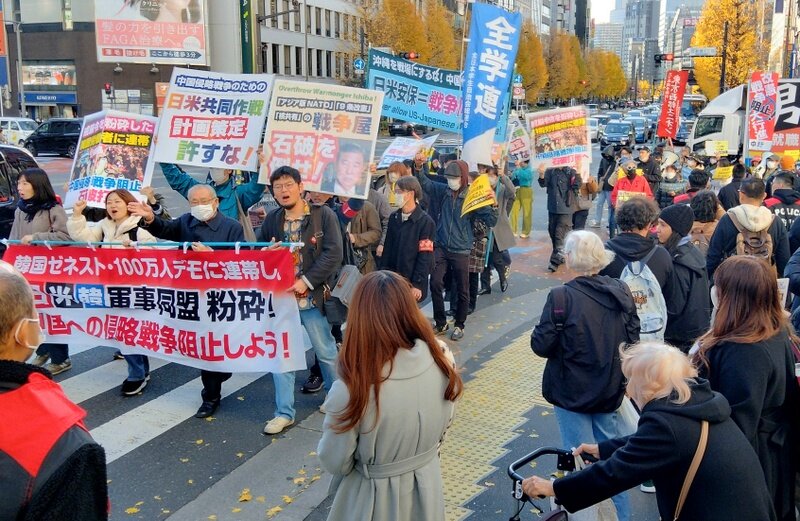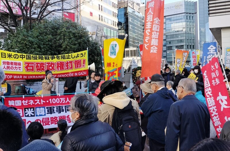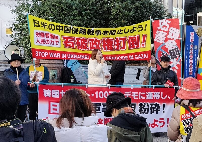 基調提起に立った洞口ともこ杉並区議はこの日のデモについて、27年にも開始されようとしている日米政府による中国侵略戦争を始まる前にとめようというデモであり、12月3日のユン・ソンニョルの軍事クーデターを実力で粉砕した韓国労働者民衆の闘いに連帯するデモだと述べ、「こうやって闘えば社会を変えることができると韓国の労働者民衆が示している。日本から韓国の闘いに連帯する道は、米日の中国への侵略戦争を阻止する巨大な反戦闘争を巻き起こすことです」と訴えました。