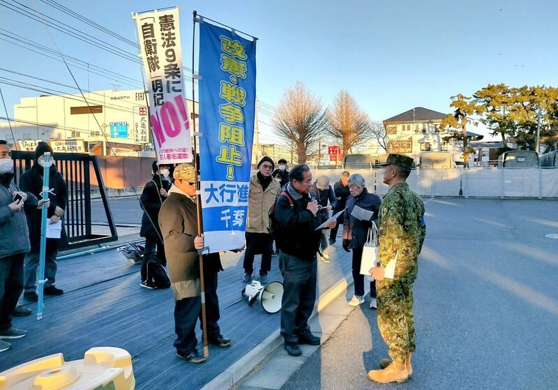 改憲・戦争阻止!大行進千葉も県内の反戦団体とともに1月11日にJR津田沼駅前で街頭宣伝を行い、パラシュート降下訓練の中止を求めて陸自習志野駐屯地への抗議・申し入れ行動を行いました。陸自第1空挺団は、陸自木更津駐屯地の第1ヘリコプター団と一体で、中国侵略戦争の最前線にたつ部隊です。木更津駐屯地には悪名高きオスプレイが17機も暫定配備され、屋久島沖で墜落した米軍のオスプレイの修理まで行おうとしています。